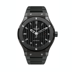 45mm black ceramic case, sapphire crystal back, black ceramic bezel, black composite resin lateral inserts and bezel lugs, carbon dial, self winding HUB 1112 movement, approximately 42 hours of power reserve, black ceramic bracelet. Water resistant to 50 meters.