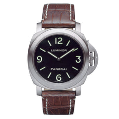 Titanium case with a brown croco-embossed leather strap. Fixed titanium bezel. Black dial with luminous hands and stick hour markers. Arabic numerals mark the 3, 6, 9 and 12 o'clock positions. Automatic C.O.S.C. Movement. Scratch resistant glareproof sapphire crystal. Declic patented winding crown protector with lever. Skeletal sapphire crystal case back. Case diameter: 44 mm. Tang clasp. Water resistant at 300 meters/ 1000 feet.