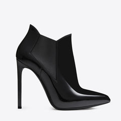 CLASSIC SAINT LAURENT HIGH HEEL BOOTIE WITH ANGLED TOP EDGE, ELASTIC PANELS AND INTERNAL PLATFORM.